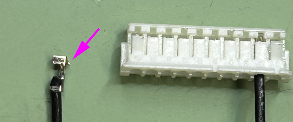 Look closely at the not-installed contact above: One side has a small ‘locking nib’ sticking out (arrow), which must be positioned to the front of the connector body, the side visible in the photo. These contacts will work their way out if not inserted properly: After inserting, give each a gentle tug to verify it is locked. Hot melt glue can help if you can’t get it to lock.